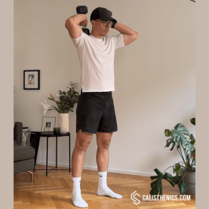 - Position the Dumbbells: Place each dumbbell on your upper traps behind your neck, holding them securely with your hands. The dumbbells should rest comfortably on the muscle, not pressing against your neck or spine.